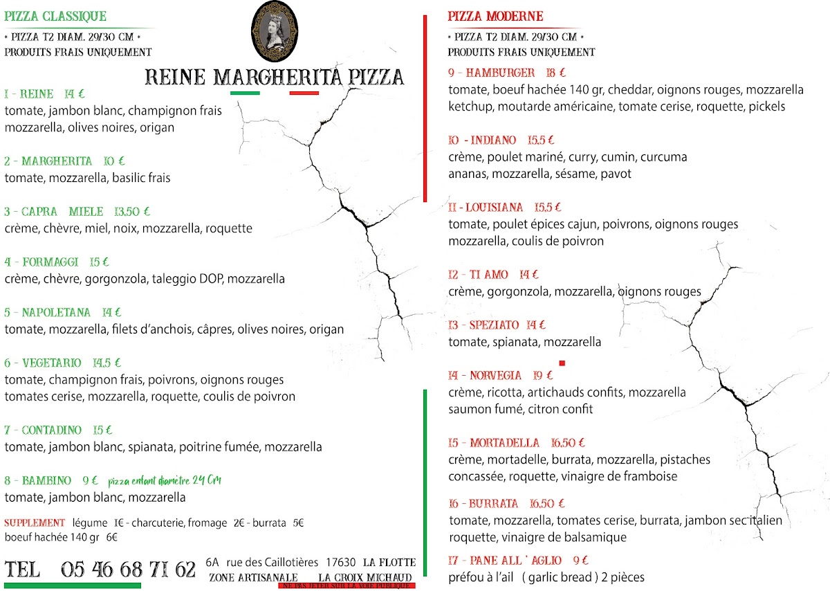Introducing the menu of Reine Margherita Pizza, located in the charming environs of La Flotte, France, is a delightful experience. The menu beautifully blends classic and modern pizza styles, ensuring there's something for everyone.